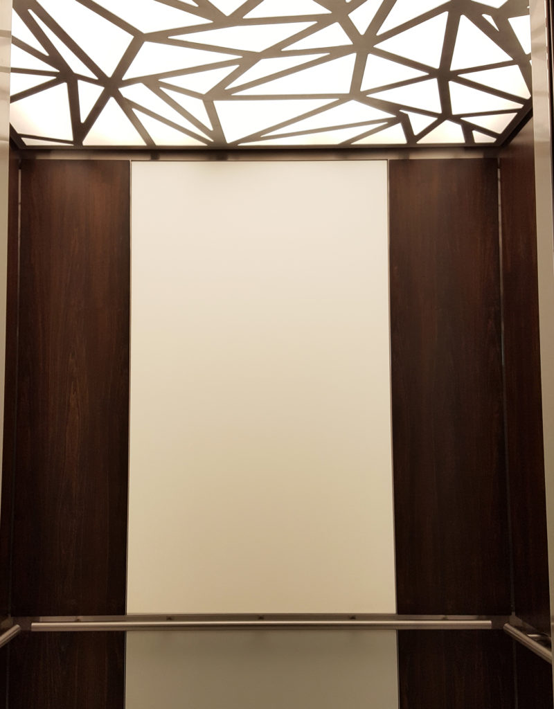 Custom aluminum ceiling with lasered design and translucent white polycarbonate diffuser panels