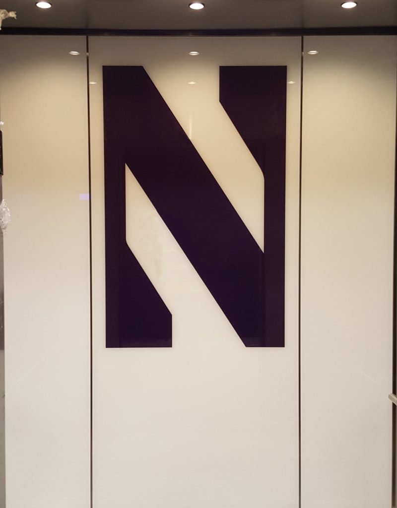 Center glass panel featuring custom Northwestern logo printed on glass inter-layer